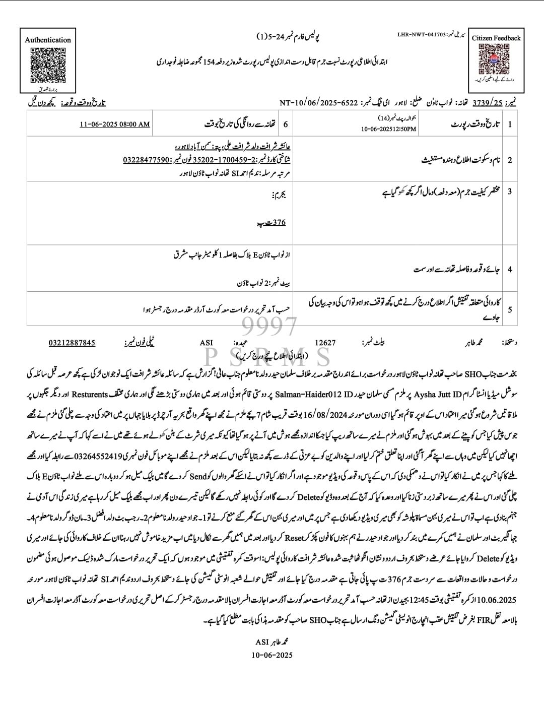 In the FIR, the victim stated that she became friends with a man named Salman Haider on social media and frequently visited various restaurants with him. One day, Salman allegedly invited her to a house in Bahria Orchard, where he drugged and raped her. He also recorded an obscene video and later used it to blackmail her. The accused reportedly sent the video to the victim’s sister, Palwasha, after which both sisters went to Salman’s house to confront him.