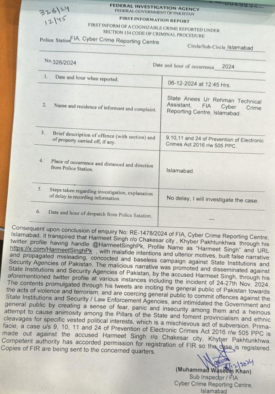 The cases against Harmit Singh are registered under sections 9, 10, 11, and 24 of the Prevention of Electronic Crimes Act 2016 (PECA), in conjunction with Section 505 of the Pakistan Penal Code (PPC), dealing with electronic crimes, public incitement, and promoting hostility between different groups.