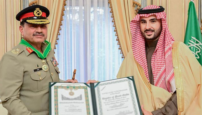 RIYADH – Saudi Arabia’s Defence Minister Prince Khalid bin Salman bin Abdulaziz awarded King Abdulaziz Medal Excellent Class to Pakistan’s Chief of Defence Forces and Chief of Army Staff, Field Marshal Asim Munir, for his key role in advancing strategic and defence cooperation between Islamabad and Riyadh.