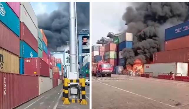 The blaze reportedly erupted in a pile of containers inside the ICT terminal, according to port sources.