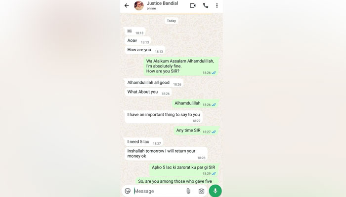According to Justice Bandial, the impersonator used his compromised WhatsApp number to seek Rs 500,000 from his acquaintances. He also shared screenshots of the fraudulent conversations to warn others about the scam.