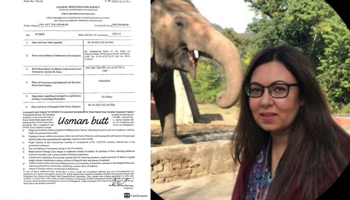 Following a directive from the Islamabad High Court on Friday, the Federal Investigation Agency (FIA) has registered an FIR against Rina Saeed. According to sources, attempts were made to delay the case for six months through stay orders. However, investigations have revealed that millions of rupees, received from foreign NGOs under the guise of wildlife projects, were siphoned off by Rina Saeed into her personal accounts.