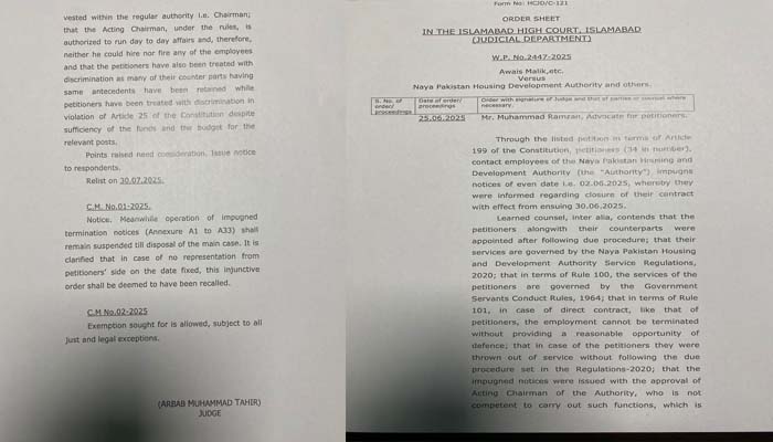 Islamabad — The Islamabad High Court (IHC) has granted interim relief to employees of the Naya Pakistan Housing and Development Authority (NAPHDA) by suspending recent termination orders issued against them. The decision was made during a hearing presided over by Justice Arbab Muhammad Tahir, who observed that the actions of the Acting Chairman appeared to be inconsistent with NAPHDA’s governing Act and Service Rules.