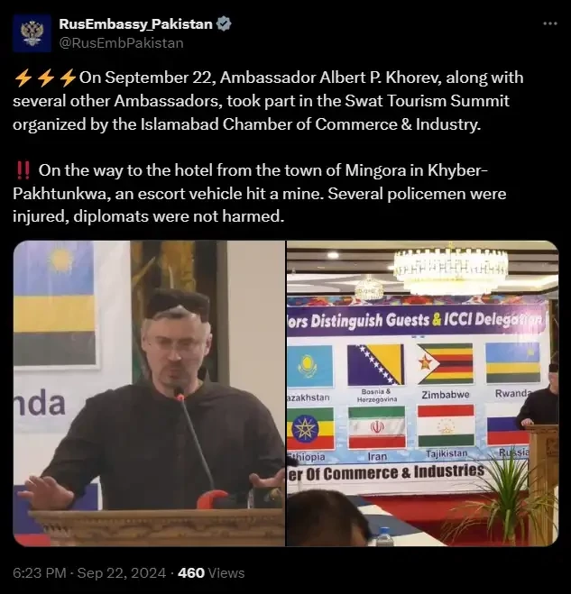 The Russian Embassy in Islamabad stated that Ambassador Albert P. Khorev was among the diplomats and that the escort vehicle hit a mine.
