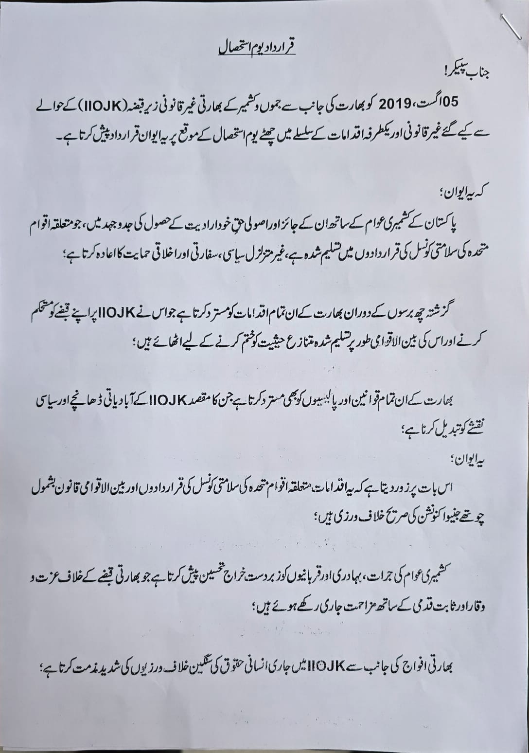 NA Unanimously Condemns India’s August 5 Actions in IIOJK