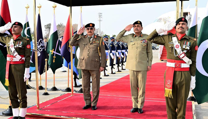 Islamabad: (Web Desk) – Libya’s Commander-in-Chief of the Arab Armed Forces, Field Marshal Khalifa Abu Al-Qasim Haftar, and Libyan Prime Minister Dr. Osama Saad Hamad met with Pakistan Army Chief Field Marshal Asim Munir, the Inter-Services Public Relations (ISPR) reported.