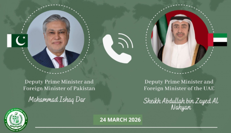 Islamabad (Web Desk): Pakistan’s Deputy Prime Minister and Foreign Minister Ishaq Dar held a telephonic conversation with the United Arab Emirates’ Deputy Prime Minister and Foreign Minister Sheikh Abdullah bin Zayed Al Nahyan to discuss the evolving regional situation.