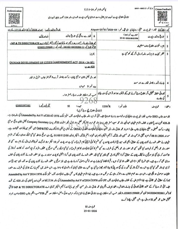An FIR has been registered at Airport Police Station against four individuals, including the owner of Faisal Town, Chaudhry Abdul Majeed. In collaboration with the police, Chaudhry Javed, the owner’s brother, has also been arrested.