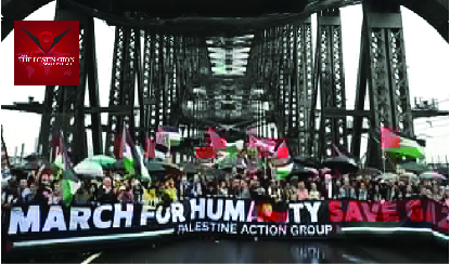 Web Desk: Sydney:Tens of thousands of demonstrators braved pouring rain to march across Sydney’s iconic Harbour Bridge on Sunday calling for peace and aid deliveries in the war-torn Gaza Strip, where a humanitarian crisis has been worsening.