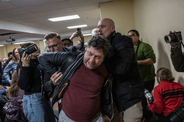 According to a Reuters witness and video footage from the town hall, a security guard quickly intervened, restraining the man and forcing him to the ground. Police later confirmed the suspect was taken into custody and charged with third-degree assault.